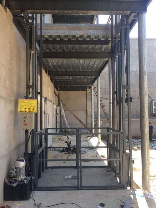 導(dǎo)軌式升降貨梯由導(dǎo)軌、側(cè)置油缸,控電系統(tǒng)主機(jī)、傳動(dòng)鏈條、保險(xiǎn)油絲繩、提升梁、提升架、工作臺(tái)面等幾大部件組成。工作臺(tái)面在導(dǎo)軌內(nèi)部運(yùn)作、油缸頂升、油絲繩作為二次保護(hù),控電箱控制升降停止。